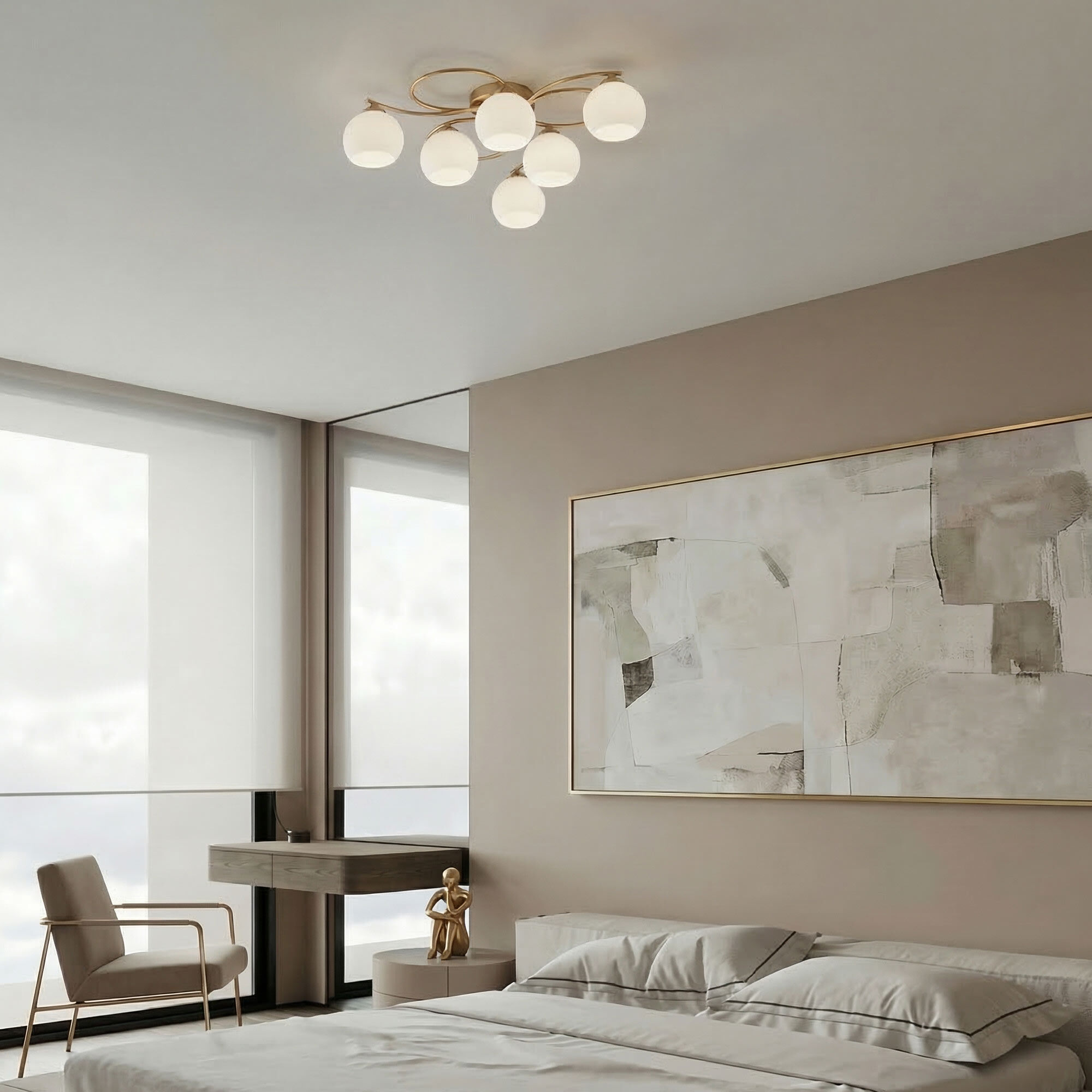 Организовать качественное освещение вам поможет современная потолочная люстра со стеклянными плафонами 30144/6 античная бронза из коллекции Alba. Металлическое основание и изящные линии люстры добавят шарма любому интерьеру, а матовые плафоны создадут комфортное и приятное освещение, идеально подходящее для спальни, гостиной или кухни. Люстра подойдет для помещений с невысокими потолками благодаря своему компактному дизайну.