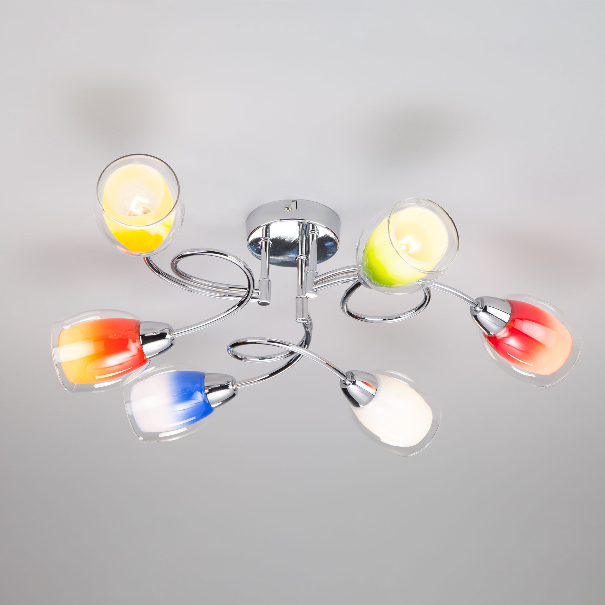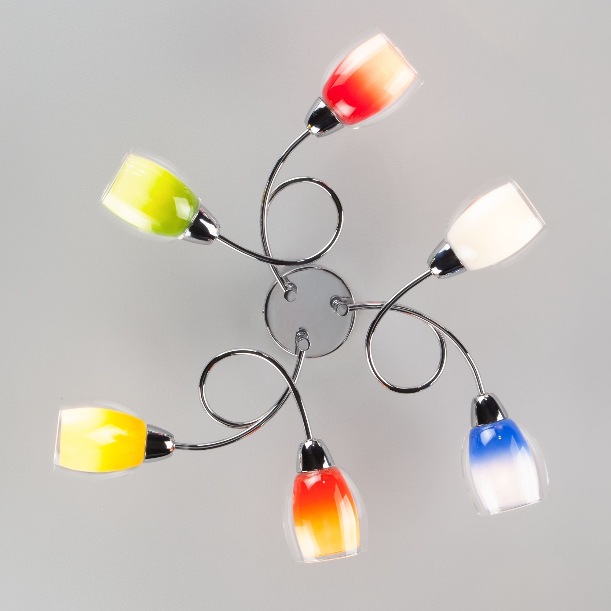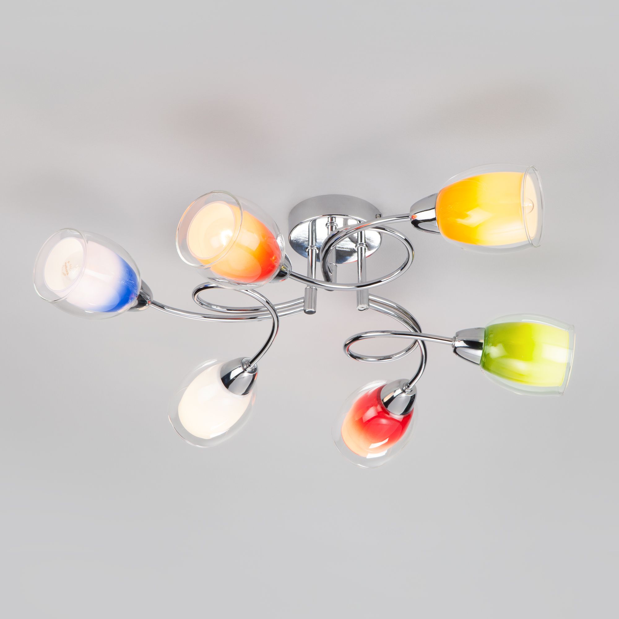 Люстра с цветными плафонами 2266/6 хром, Организовать качественное освещение в детской комнате вам поможет потолочная люстра с цветными плафонами 2267/5 хром. Простые эргономичные формы и умеренные тона станут прекрасным дополнением для вашего интерьера. Люстра украсит помещение и создаст полноценное освещение на площади 19 м². В люстре рекомендуется использовать сменные лампы с цоколем Е14 с максимальной мощностью 40 Вт. В производстве люстры использовали высококачественный металл с надежным защитным покрытием и закаленное стекло.