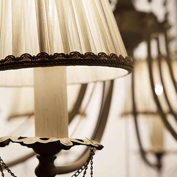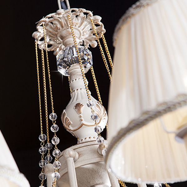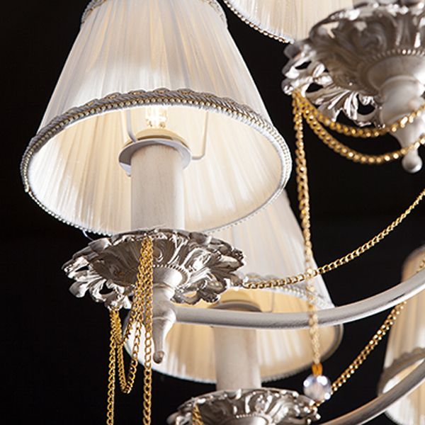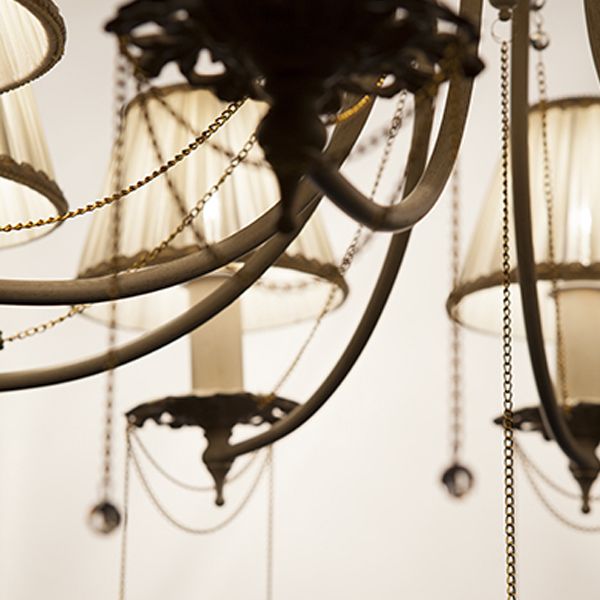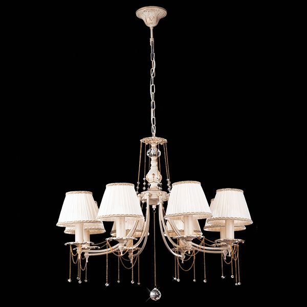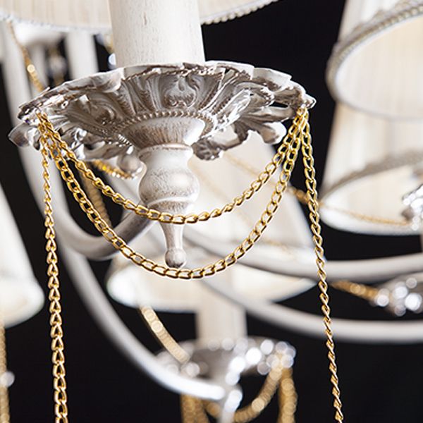 Дизайнерская люстра оснащена патронами с цоколем Е14, которые рассчитаны на максимальную мощность ламп 40 Вт. Люстра украшена эффектным декором из хрусталя и дополнена выразительными тканевыми плафонами. Арматура изготовлена из высококачественного металла с надежным защитным покрытием.