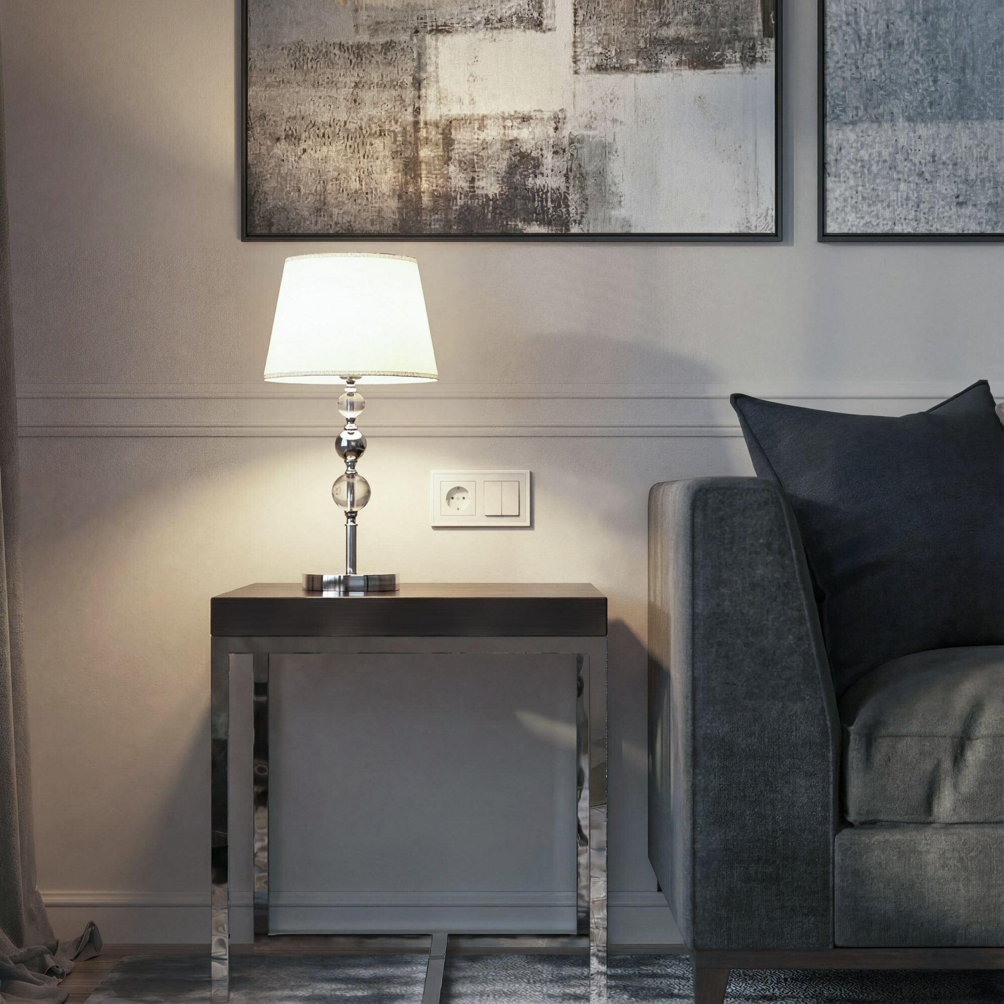 Благодаря белому тканевому абажуру настольная лампа создает мягкое рассеянное свечение, подходящее для комфортного чтения книг в вечернее время. Прочный металлический корпус светильника устойчив к механическим воздействиям, а защитное покрытие обеспечивает надежную электроизоляцию и презентабельный внешний вид.