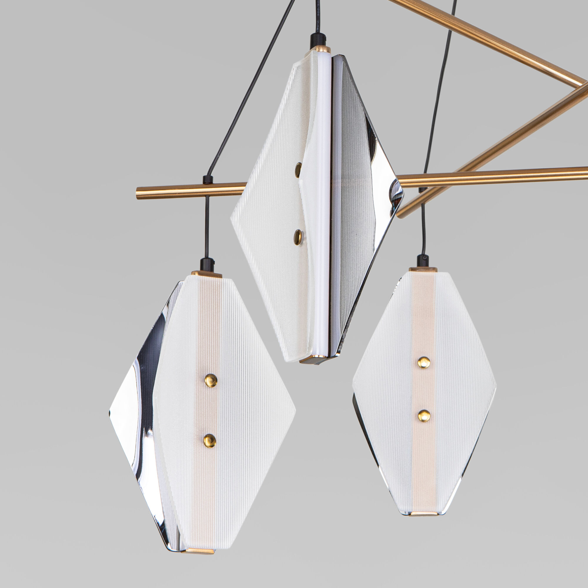 Необычный дизайн Glare, сочетающий строгие линии и мягкое сияние, приковывает взгляд и создает атмосферу уюта и современности. Геометрические плафоны ромбовидной формы с рельефной текстурой преломляют свет, создавая игру теней и бликов.