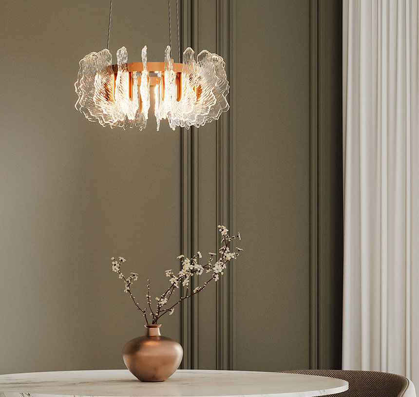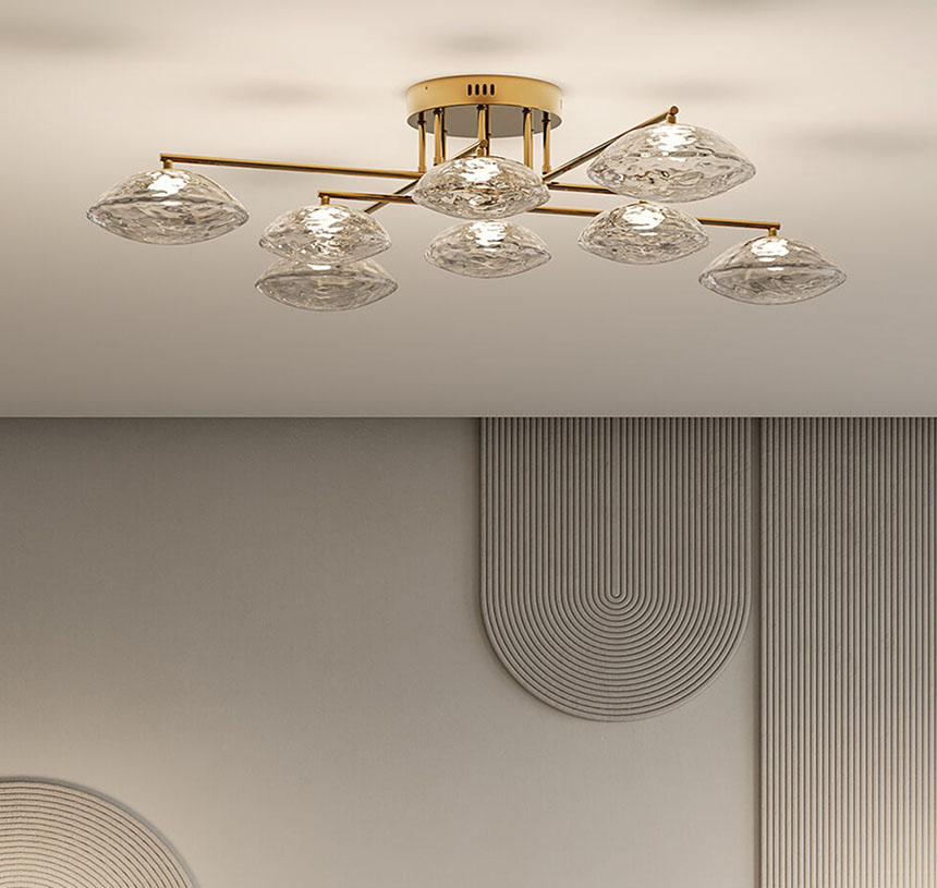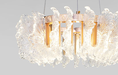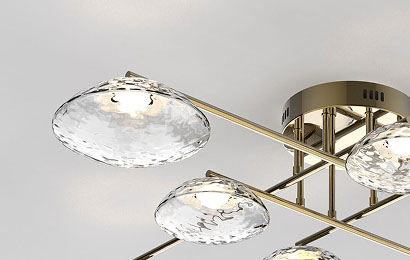 Концепция волнообразных форм стала источником вдохновения для создания светильника, в котором крупная фактура литого стекла, напоминающая застывшие водные струи, создает завораживающую игру светящихся бликов, меняющихся с каждым взглядом.